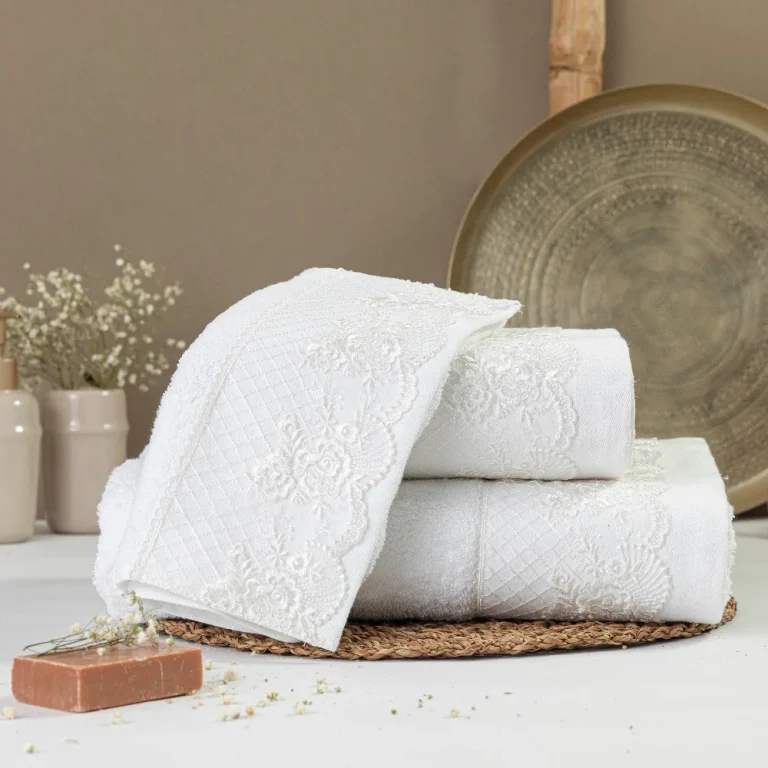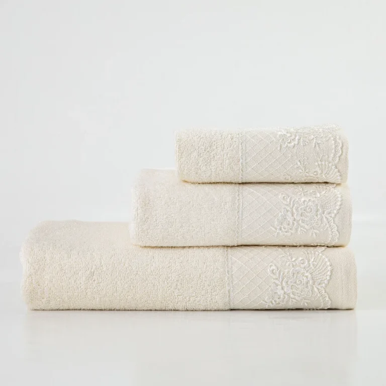 Το σετ περιλαμβάνει πετσέτα μπάνιου, πετσέτα προσώπου και πετσέτα χειρός, καλύπτοντας πλήρως τις καθημερινές ανάγκες προσωπικής φροντίδας. Η διακριτική διακοσμητική δαντέλα προσθέτει κομψότητα και στυλ, ιδανικό για μοντέρνα αλλά και κλασικά μπάνια.