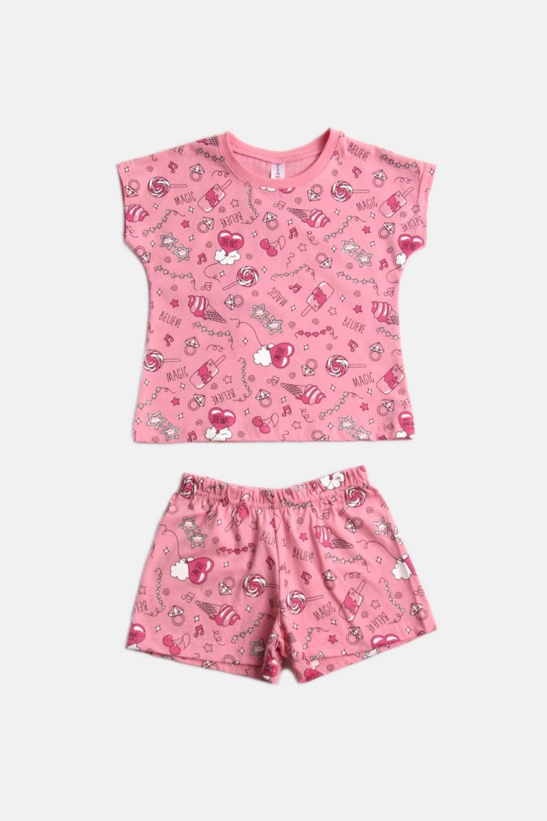 - Πυζάμα παιδική για κορίτσι 1 έως 5 ετών με διάσπαρτο τύπωμα με μπλούζα κοντομάνικη σε ροζ χρώμα .