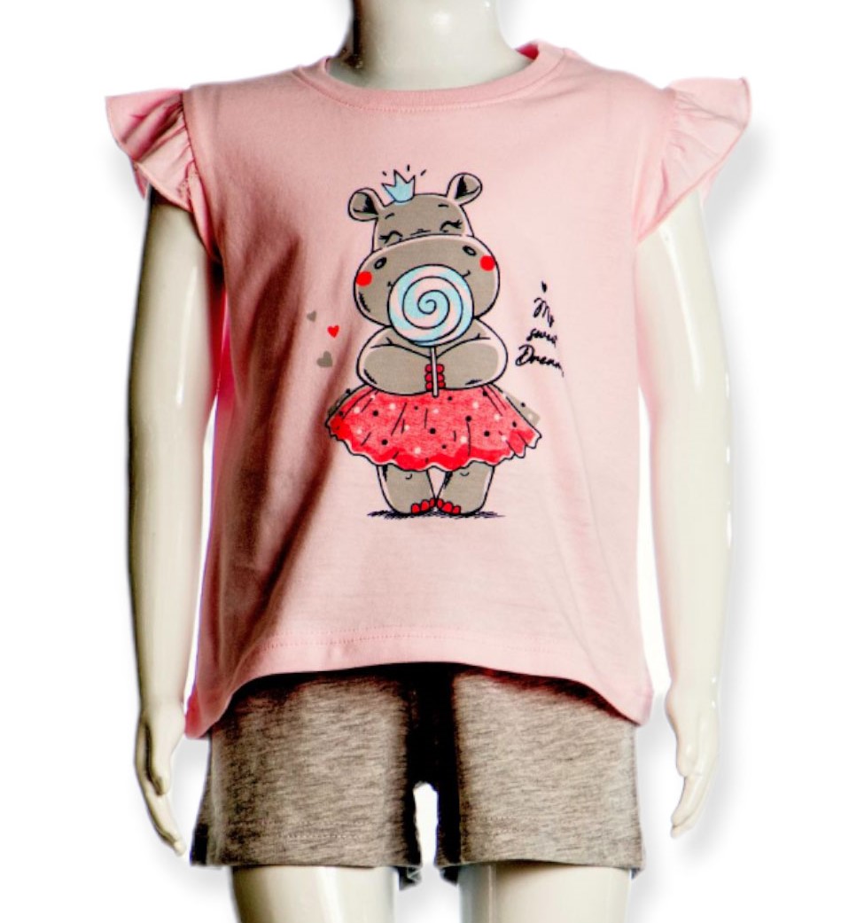 - Πυζάμα καλοκαιρινή παιδική για κορίτσι 1 έως 5 ετών με τύπωμα “ζαχαρωτά” με μπλούζα κοντομάνικη σε χρώμα ροζ.